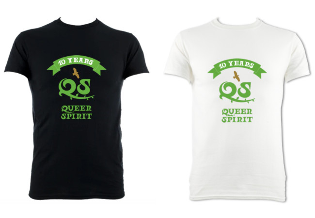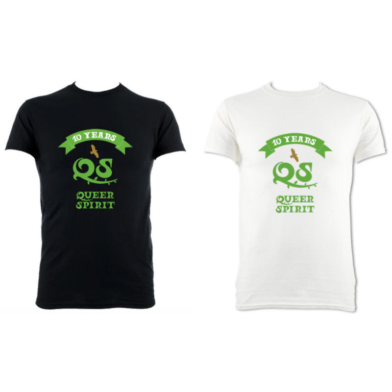 A unisex cotton t-shirt with a classic style (taped neck and shoulders), made exclusively for Queer Spirit and featuring a design celebrating the 10th anniversary of Queer Spirit.