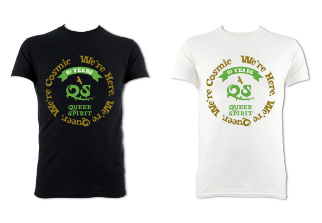 A unisex cotton t-shirt with a classic style (taped neck and shoulders), made exclusively for Queer Spirit and featuring a design celebrating the 10th anniversary of Queer Spirit.