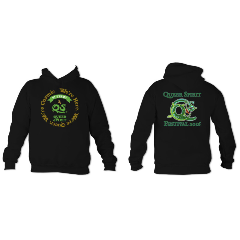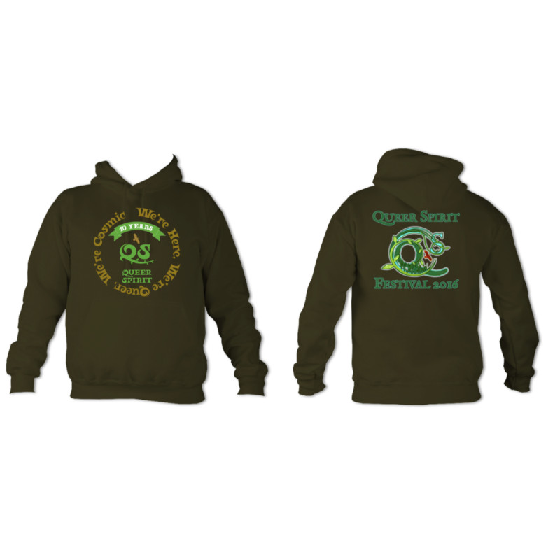 The hoodies are produced for Queer Spirit by a carbon-neutral company, that reduces, recycles or reuses all they can, and offset those emissions they can't.
